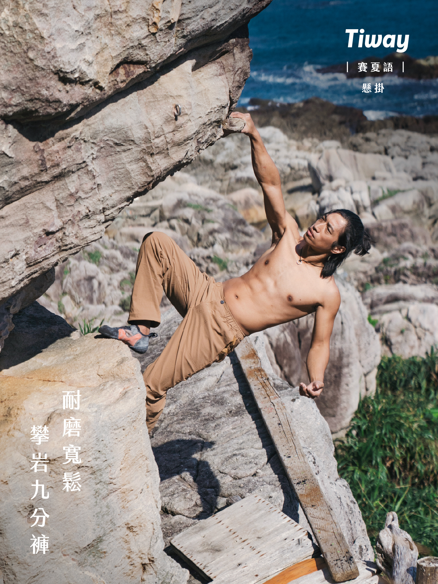 Tiway九分攀岩褲穿起來舒適,寬鬆而不垮,版型看起來立體有挺。在日常行走的時候,大腿內側不會有因磨擦產生摩擦窸窣的聲音或感覺,布料觸感相當柔軟。在一般的攀岩表現上,不論是高抬腳還是動態跨步…等需要分腿的動作,Tiway都能提供舒適的胯下活動空間,不會因為布料彈性、剪裁設計的緣故,而造成動作的限制,限制動作的因素只會是自己的柔軟度。