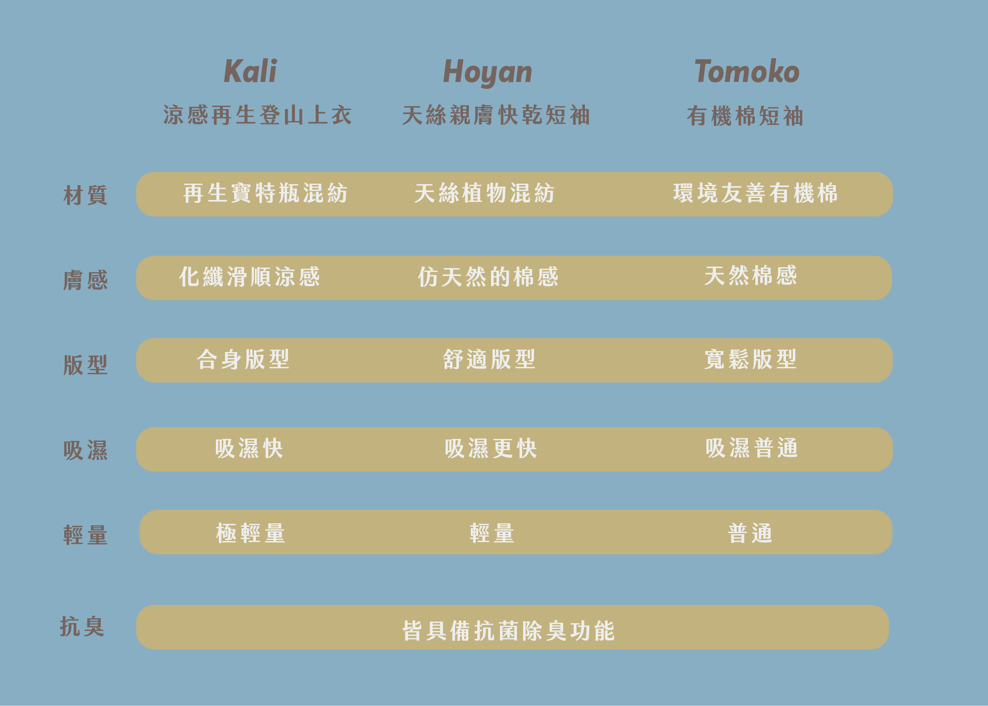 Kali 涼感再生排汗衫、Hoyan 天絲親膚快乾衣、Tomoko 有機棉短袖,將這三款上衣,做個超級比一比,希望大家都能找到合適的裝備!