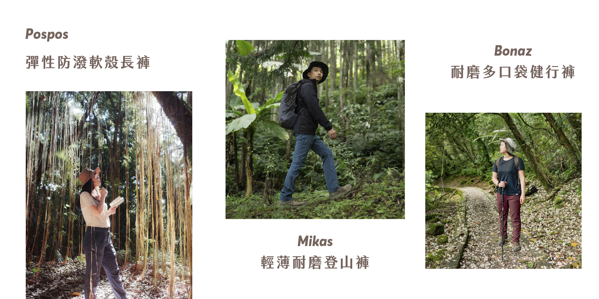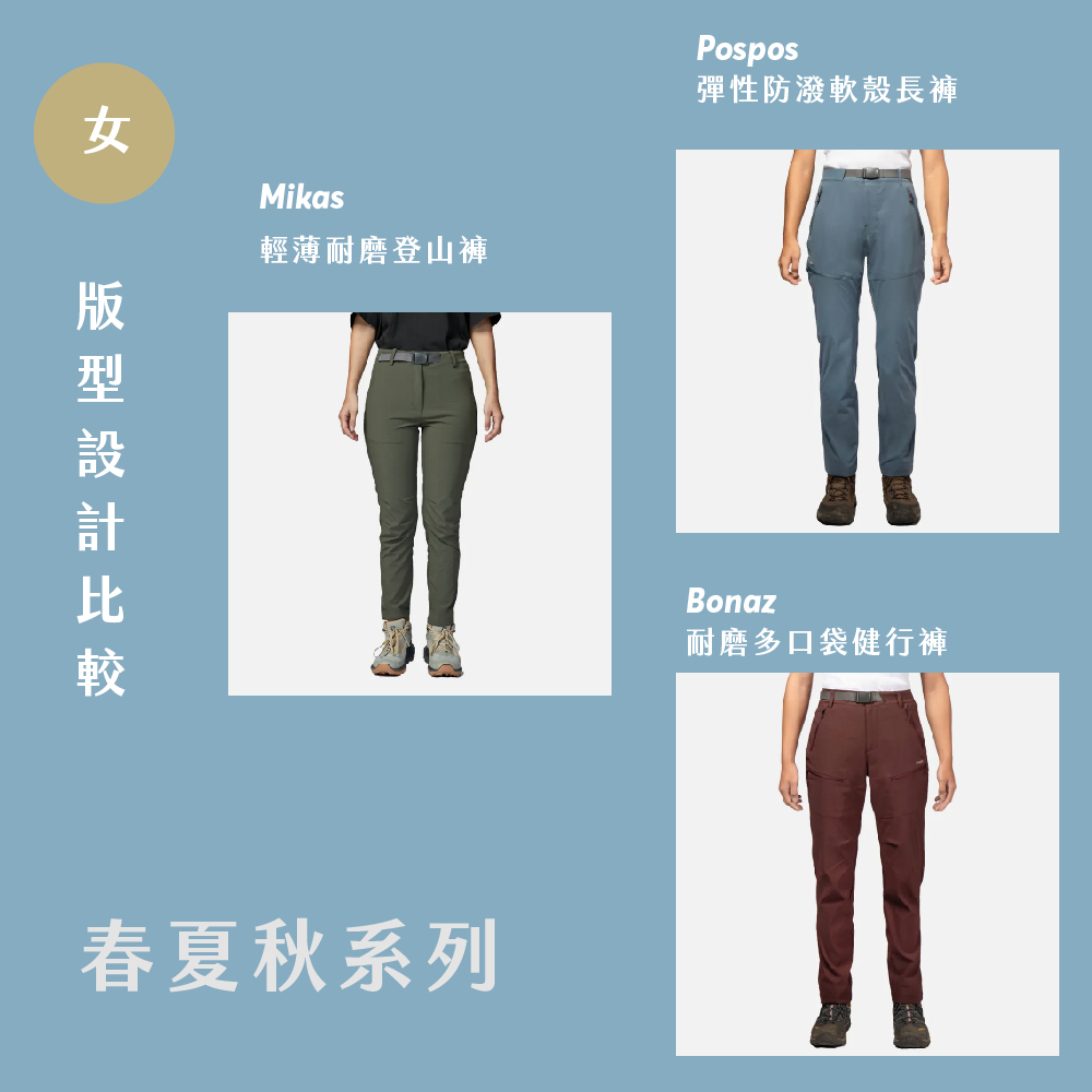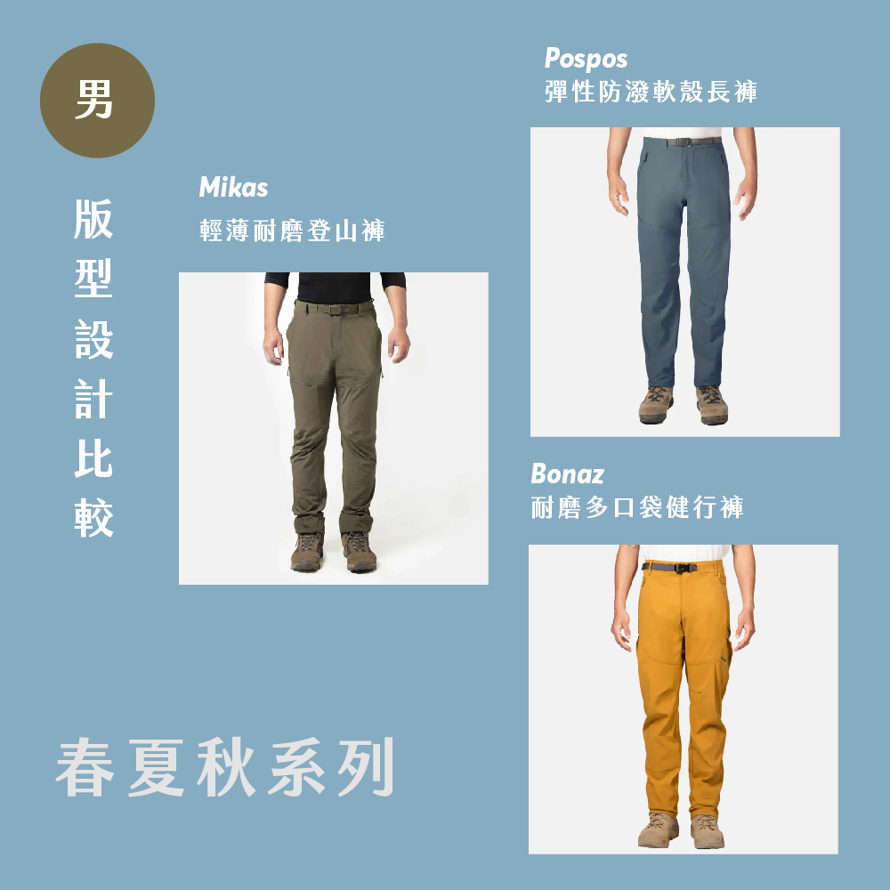 Mikas 耐磨褲、 Pospos 軟殼長褲 、 Bonaz 健行褲