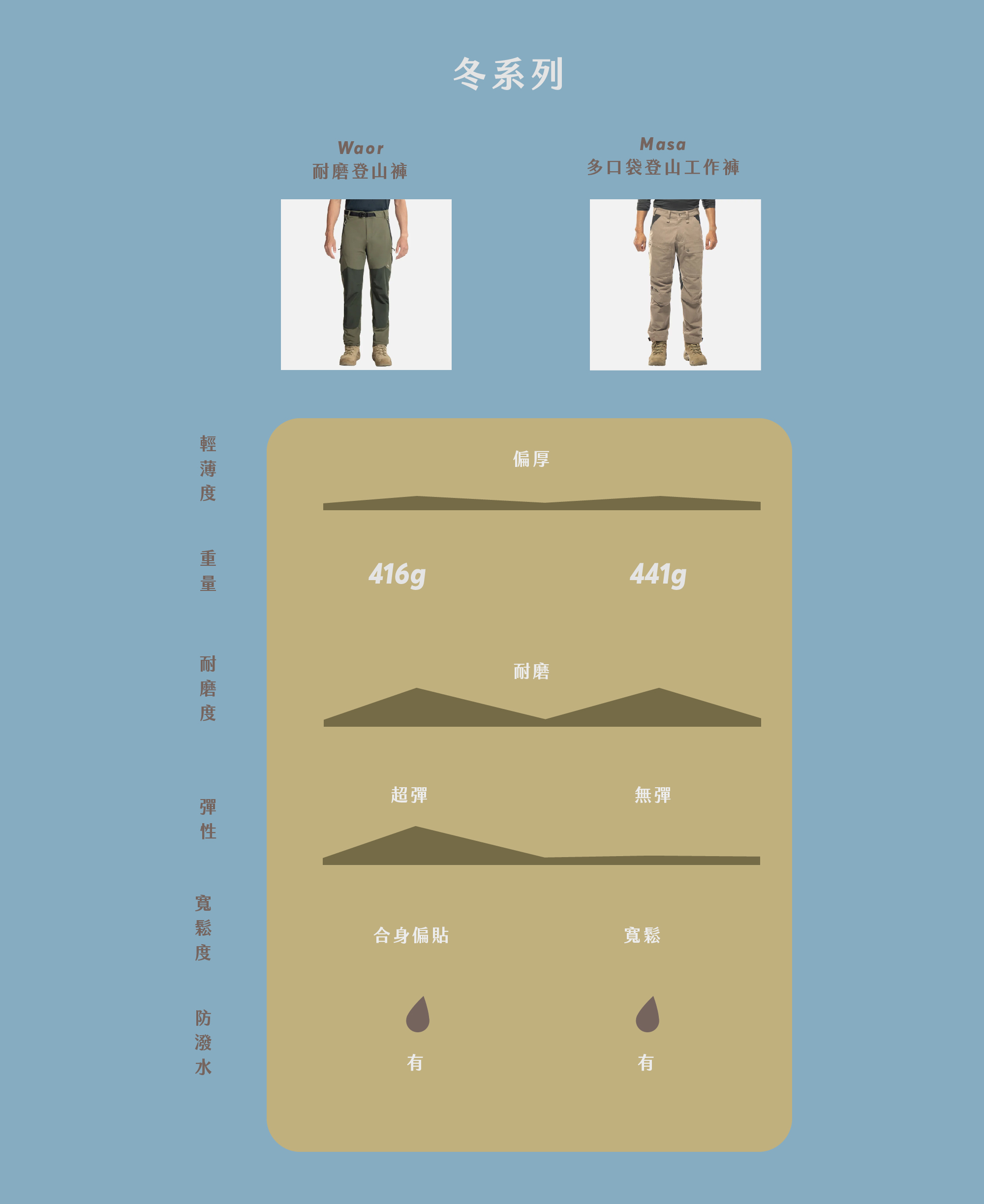 Pospos 軟殼長褲 218g > Mikas 耐磨褲 238g >Bonaz 健行褲 334 g > Waor 工作褲 416g > Masa工作褲 441 g