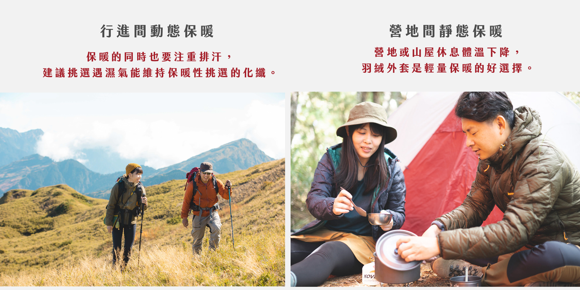 到營地或山屋休息時,靜止時體溫會下降,尤其在山上入夜後到清晨溫度下降到更低,更需要足夠保暖才能一覺好眠。