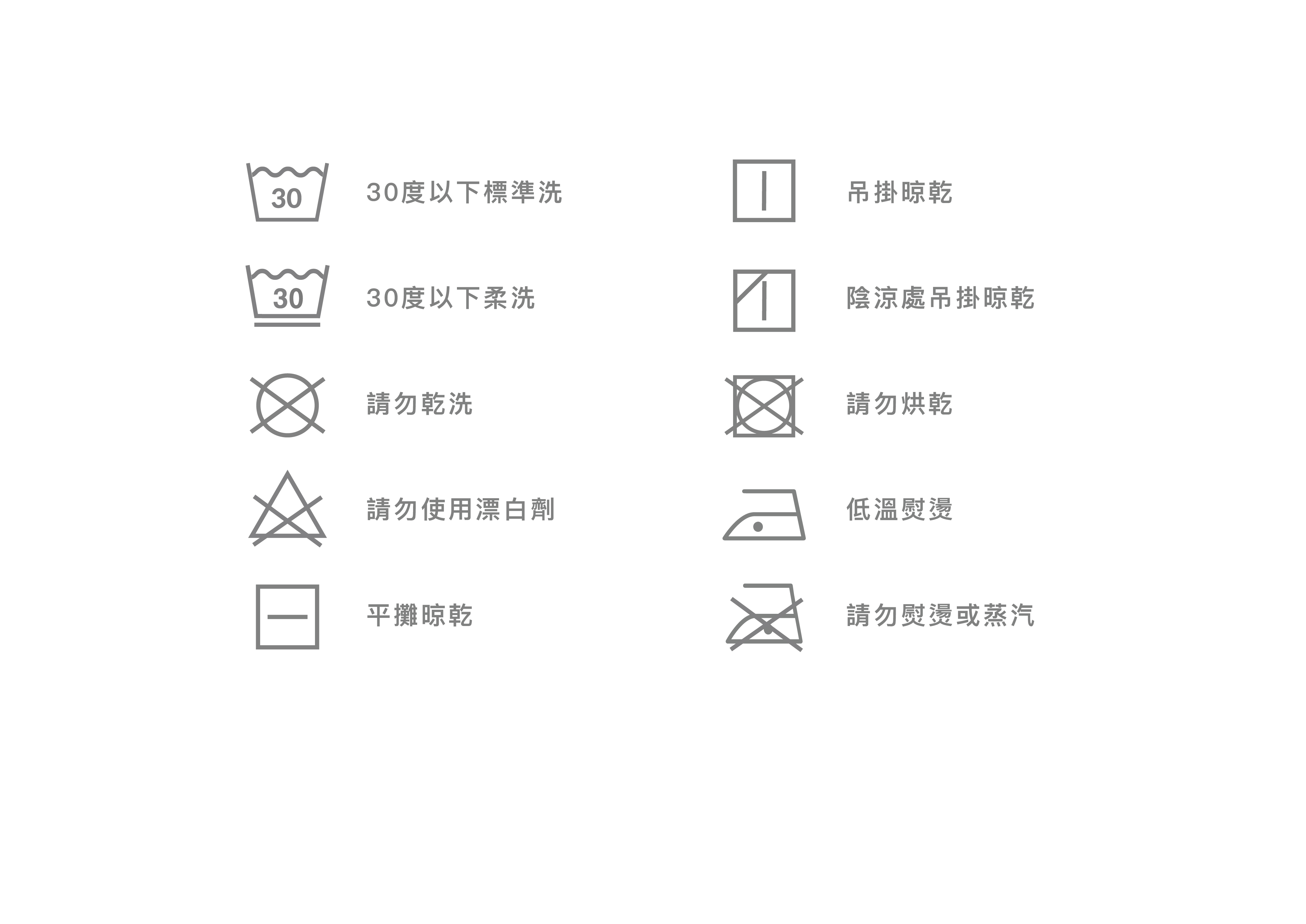 8. 請勿乾洗、烘乾,使用低溫熨燙。