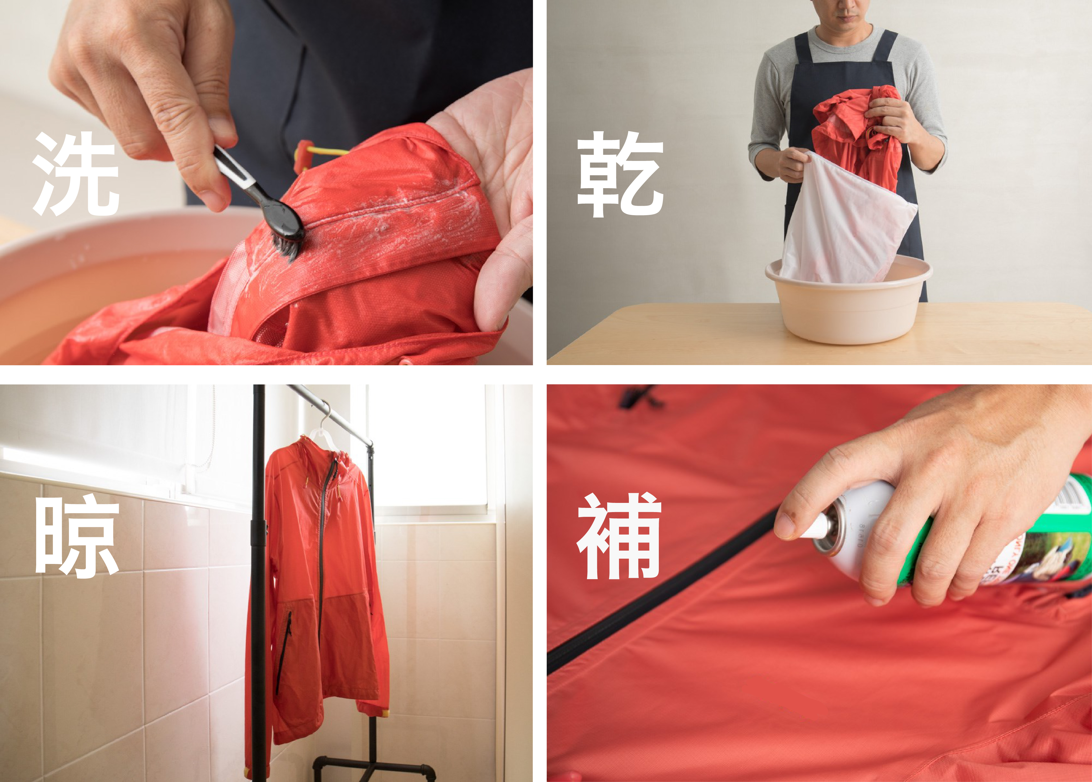 當防潑水失效可補充防潑水劑:將外套平放,補充噴霧性防潑水劑,噴完後用吹風機或放入烘衣機低溫烘乾(因需加熱來活化防潑水劑的功效)。