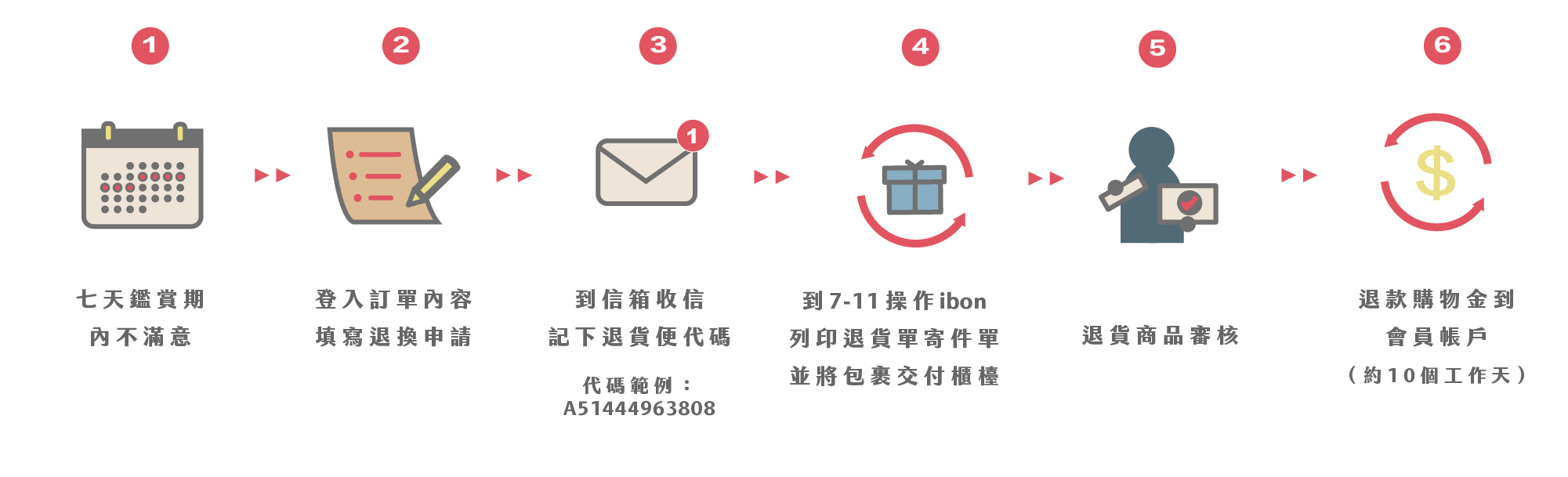* 在訂單送貨狀態為「已到達」或「已取貨」,且在7天鑑賞期內才可申請退貨。