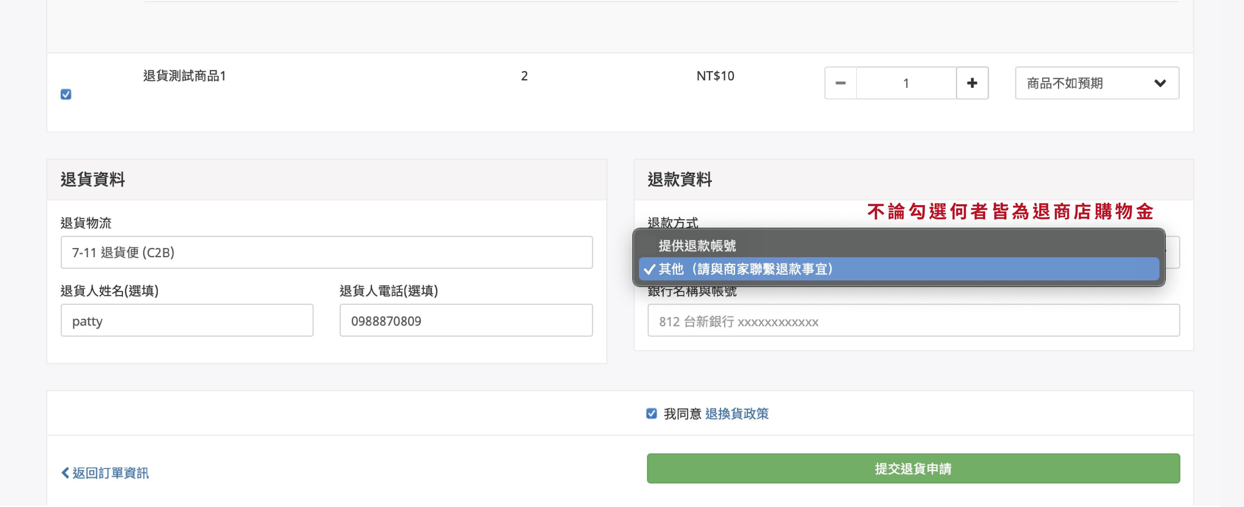 3. 勾選訂單內欲退貨的商品、數量、原因,退貨及退款資料,完成後點選「提交退貨申請」。