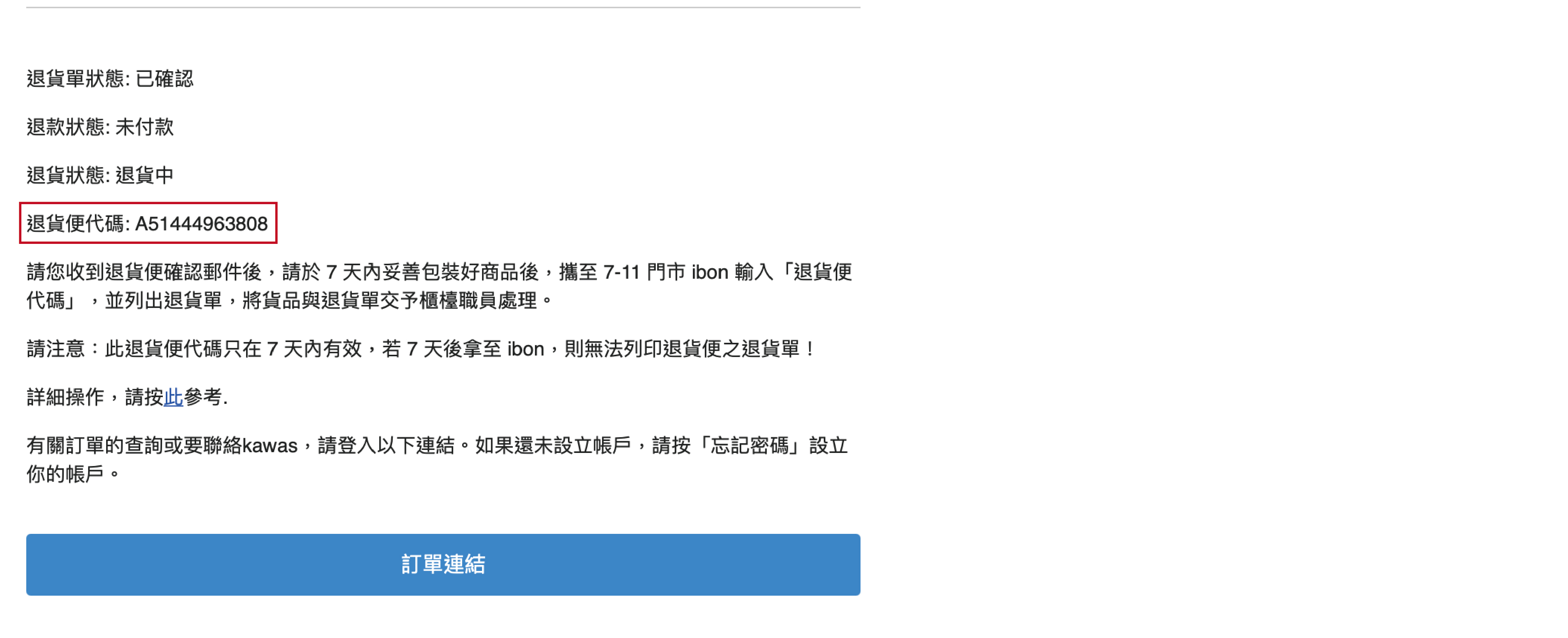 5. 於電郵取得退貨便代碼 (代碼範例:A51444963808),請帶著這組代碼和退貨商品於「三日內」至7-11辦理。
