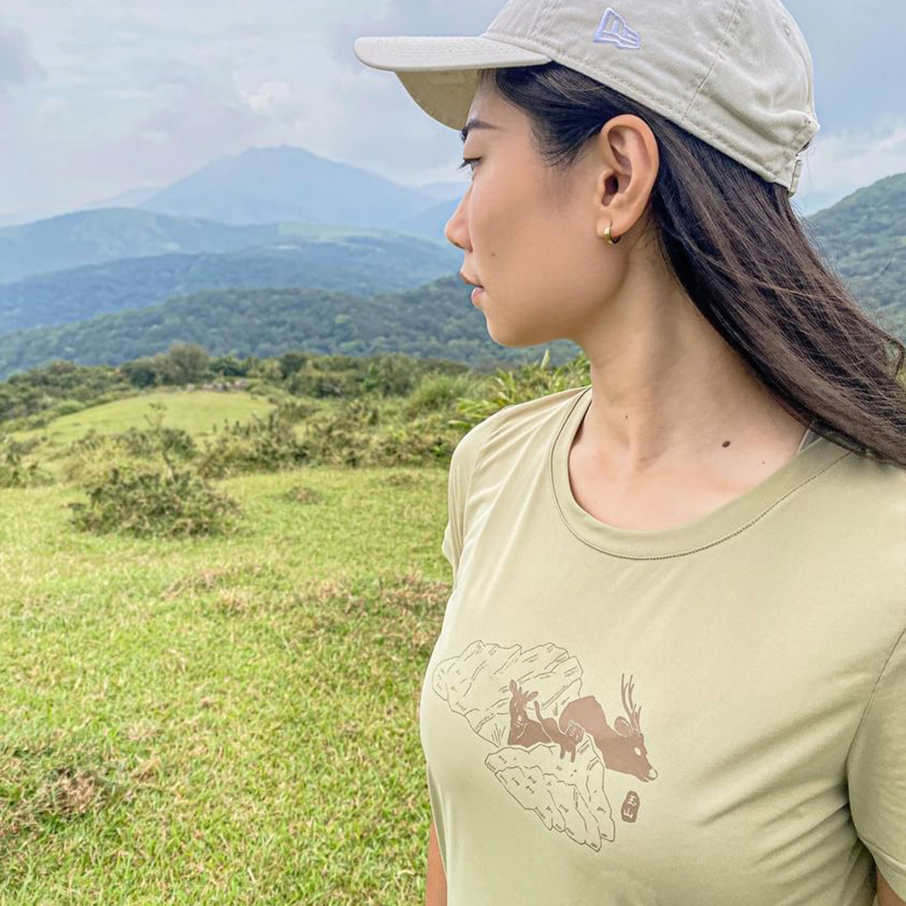 把山剖半,深入台灣山林找出特有種,沙丘黃搭配的是玉山、黃喉貂、台灣野山羊和台灣水鹿,我最喜歡的台灣山林象徵都在這件衣服中了,更採用寶特瓶回收材質,資源真正再利用,除了用雙腳踏入台灣山林感受自然之美,也必須讓山徑延續向前,如同今天走在荷蘭古道,與百年前的時空,平行交會。