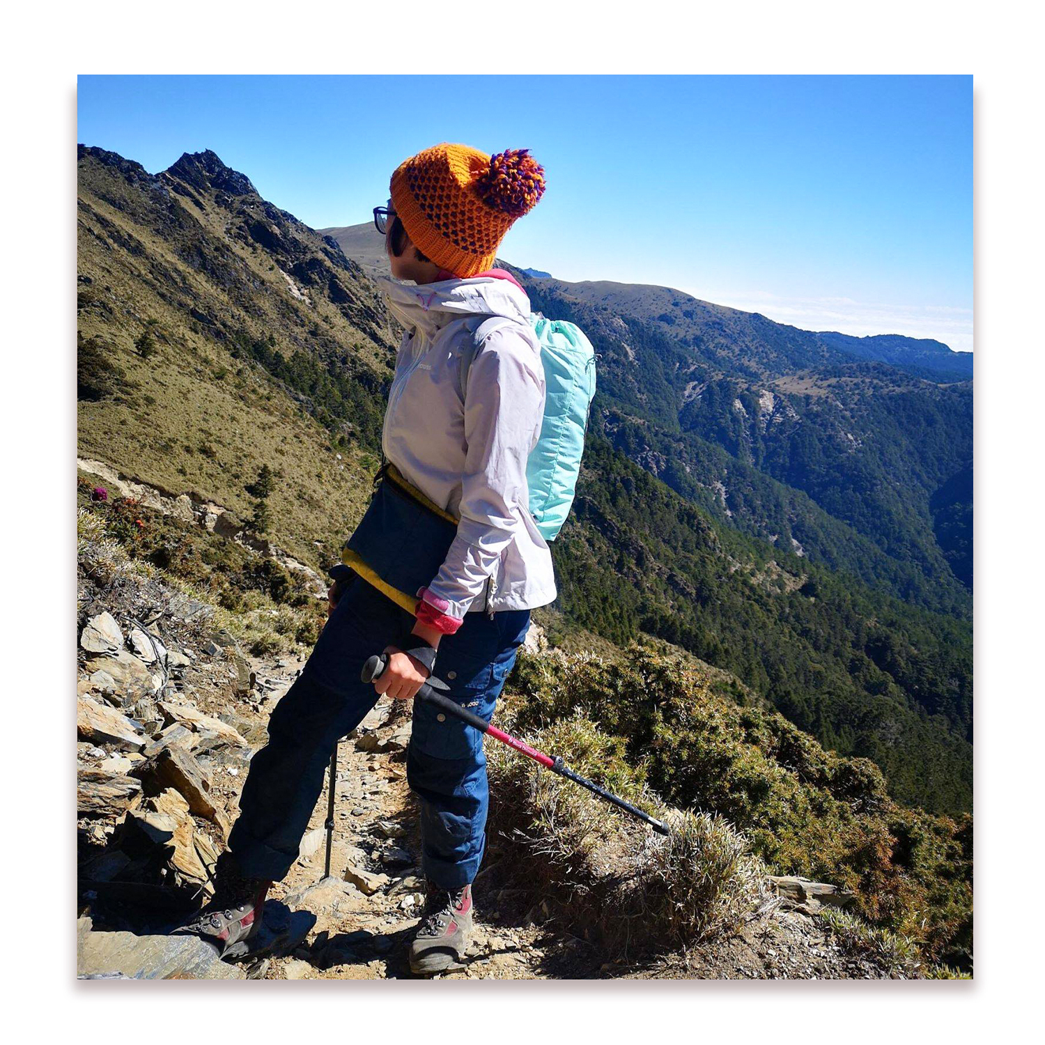 這趟玉山行白天溫度約16~18度,穿著走不會有悶熱感,曬到太陽開始有悶熱感時只要把拉鍊拉開透氣就可以了。