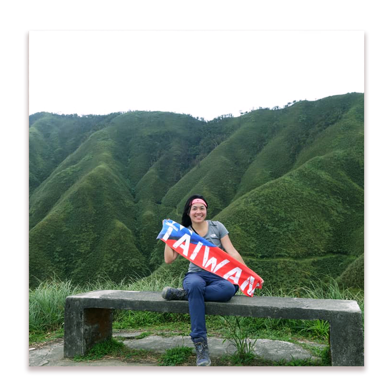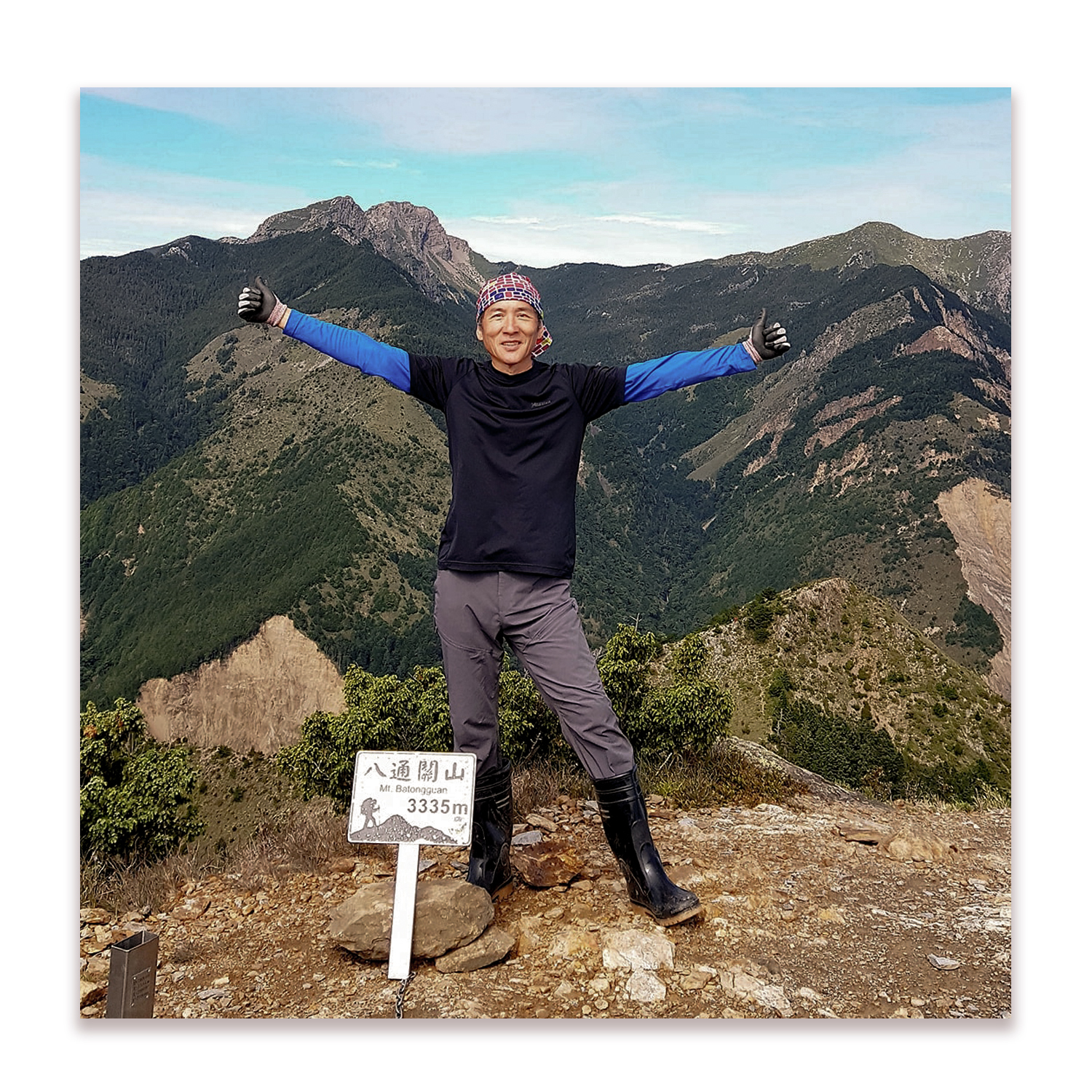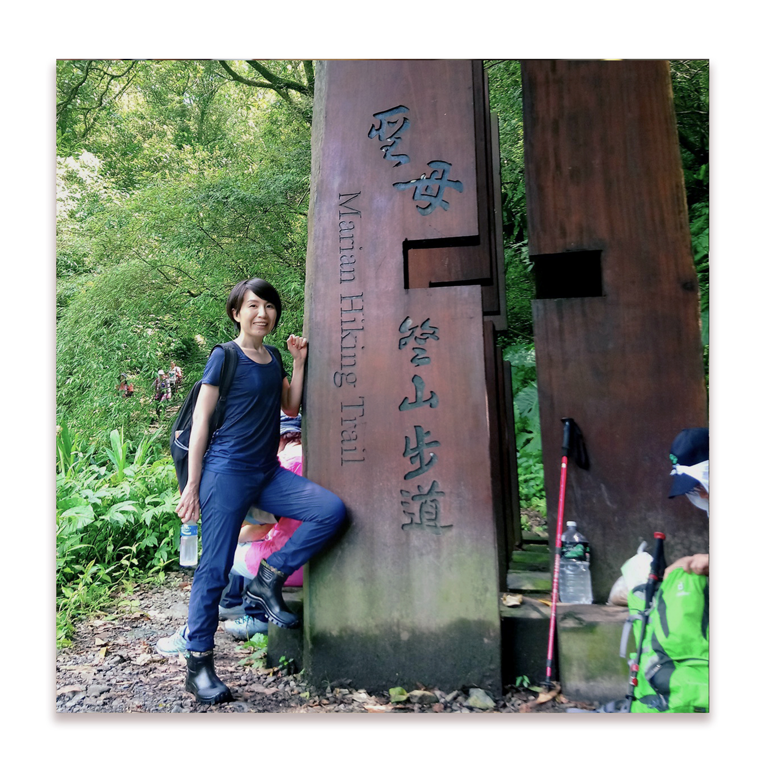 現在是熱情的八月…有一張靠在寫步道名字木樁牌的照,其實上衣差不多全濕…跨下全汗,有”速乾”嗎分不太出來,倒是也不粘身不會太不舒服就是。