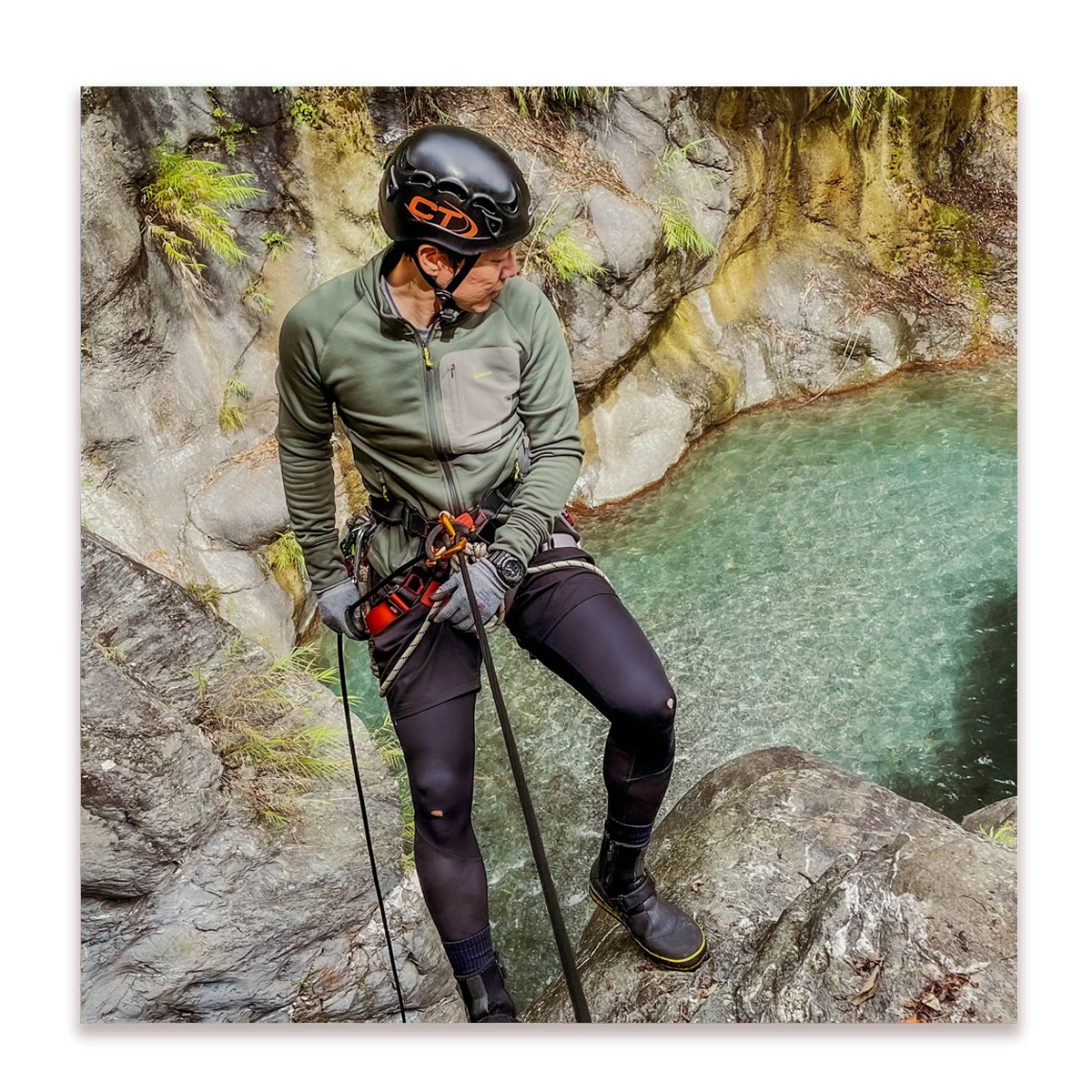 溯溪當天氣溫約攝氏26-27度,頻繁的下水、出水、攀爬、架繩、垂降,四向彈性布料不阻礙我的動作,入水時也沒有體溫被大量帶走的不適感;午餐後再次穿上它,已經濕透的外套在穿上的那一刻,裏布接觸皮膚的瞬間的感受竟然不是冰冷的,這點讓我非常驚艷!