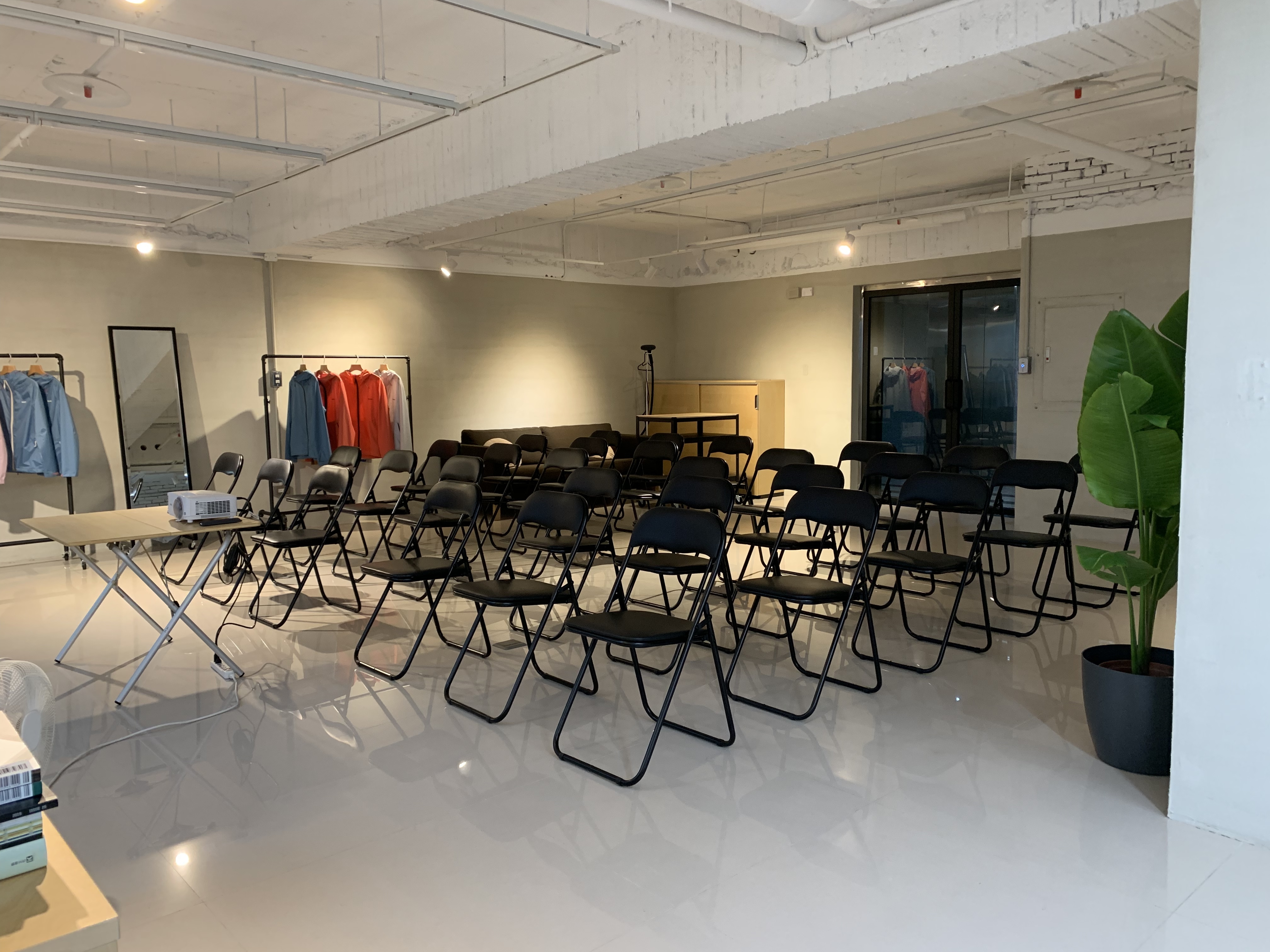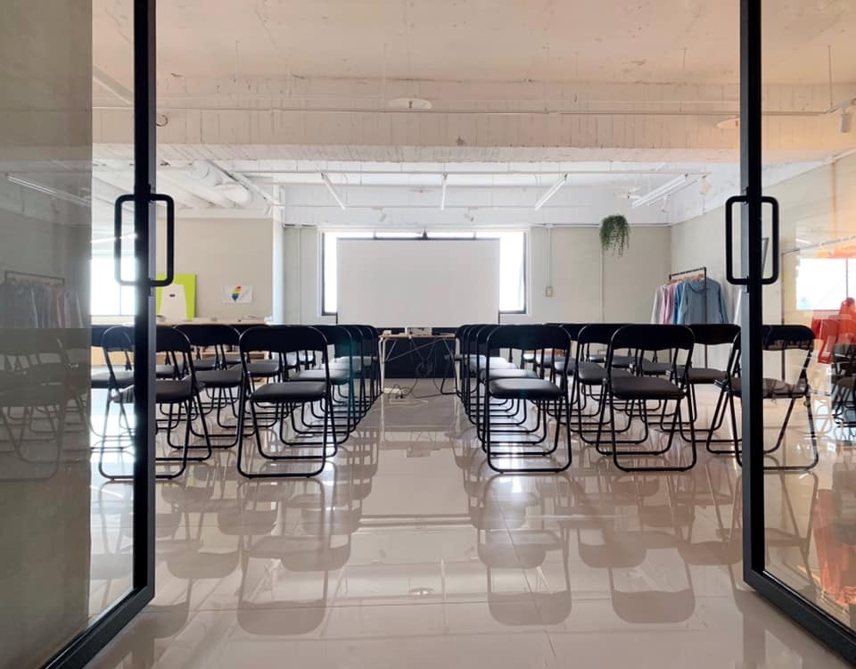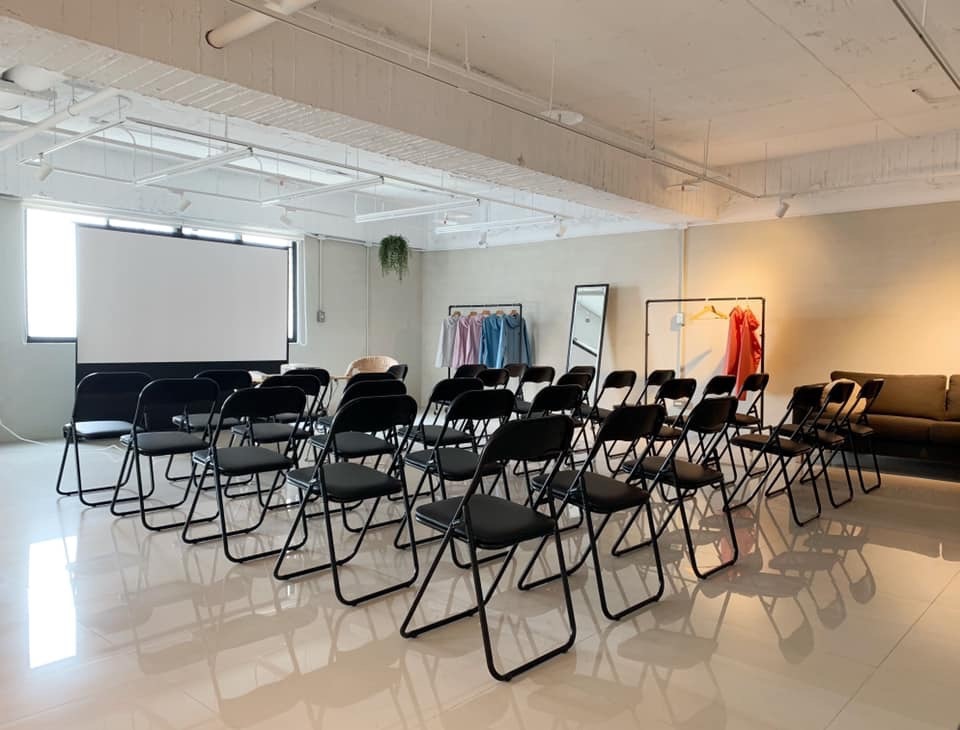 空間可容納35人。設備有投影機、MacBook筆電、音響、投影幕、麥克風、透影幕、AppleTV