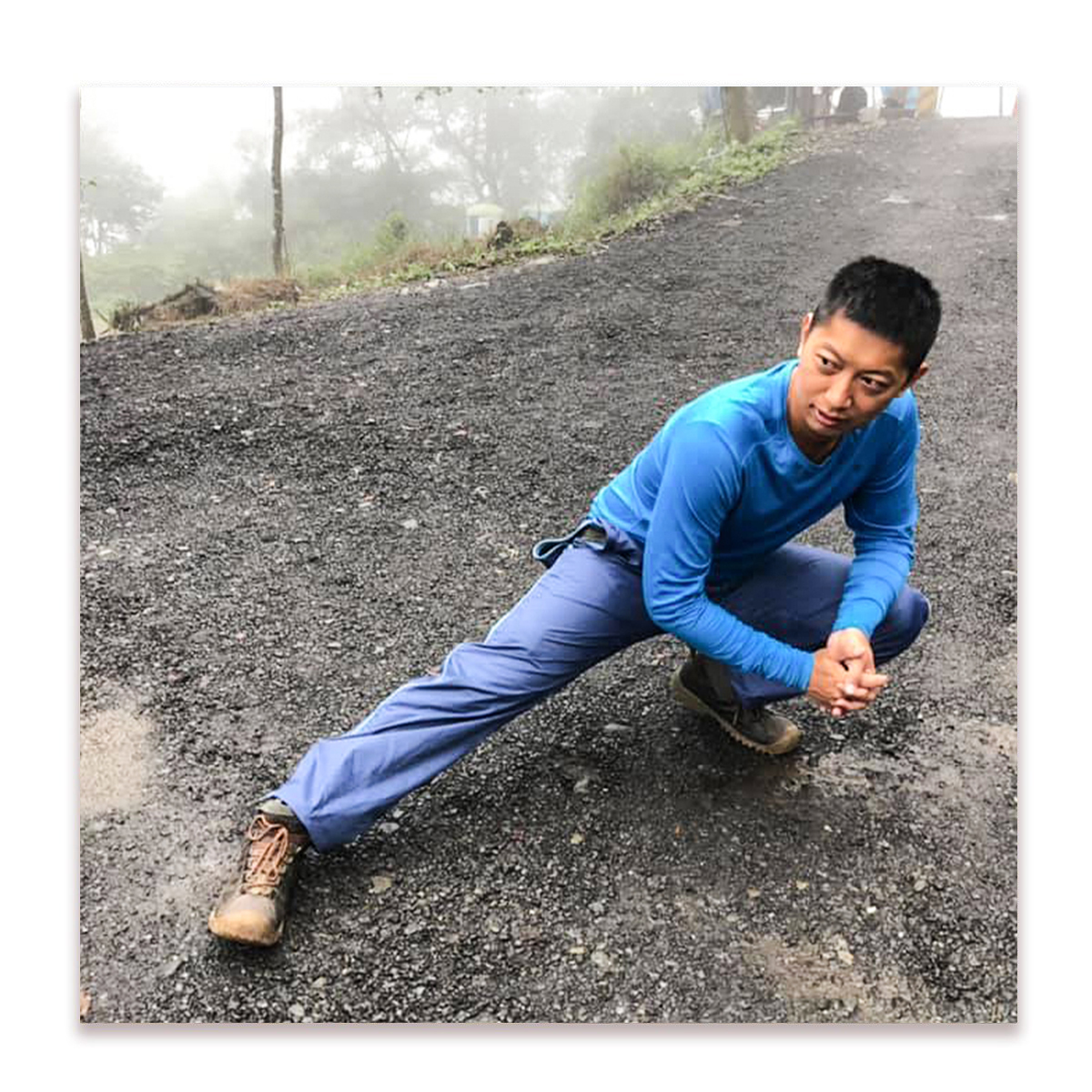 在登山前的暖身,特地大開大闔來測試穿著雨褲後的活動性,就跟沒穿雨褲一樣,與內著登山褲完美結合,行進中的高台階的抬腳也不會有卡卡的感覺,雙向拉鍊的好處在於行進間可以大面積的散熱,在遇到灌木較高的地段,也能快速拉上拉鍊,防止水從散熱處進入。