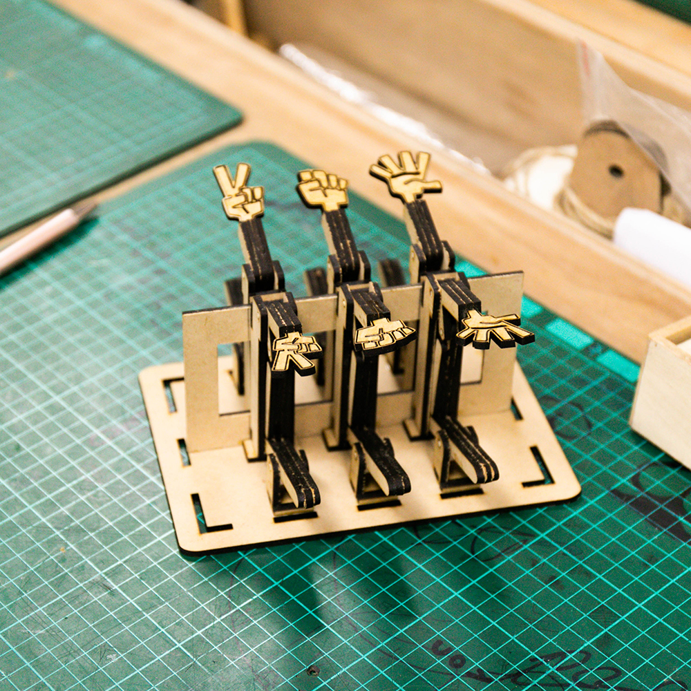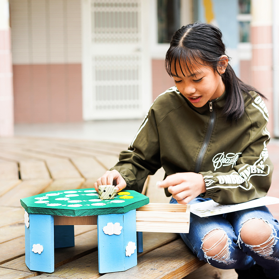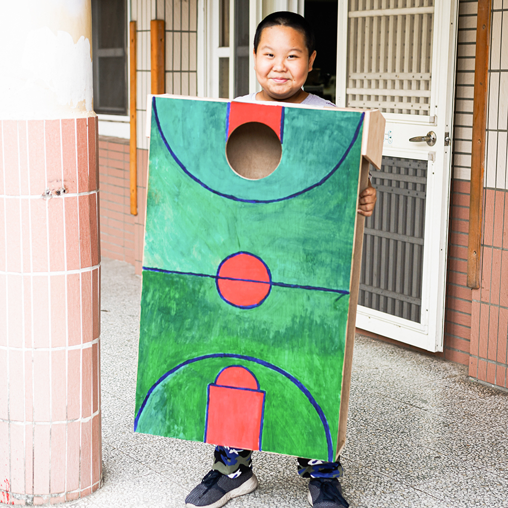 木工社的伯賢同學說:『 因為他很喜歡打籃球,所以想做一個跟籃球有關的木工玩具。』於是他利用木工社的器具,以沙包當作籃球,以木工做成一個籃框,製作出一個『大號三分球』的遊戲。他甚至做了兩組,放在學校操場上,給低年級的小朋友多一個下課遊玩的選擇。