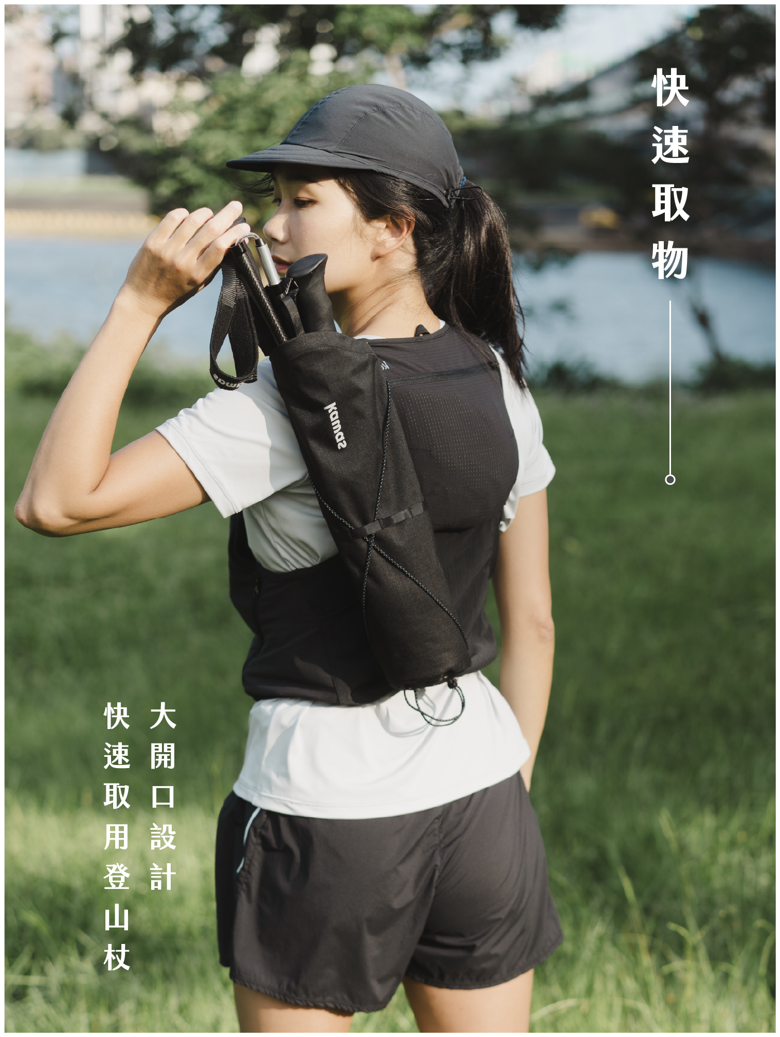 大開口設計方便行進中快速取用登山杖,