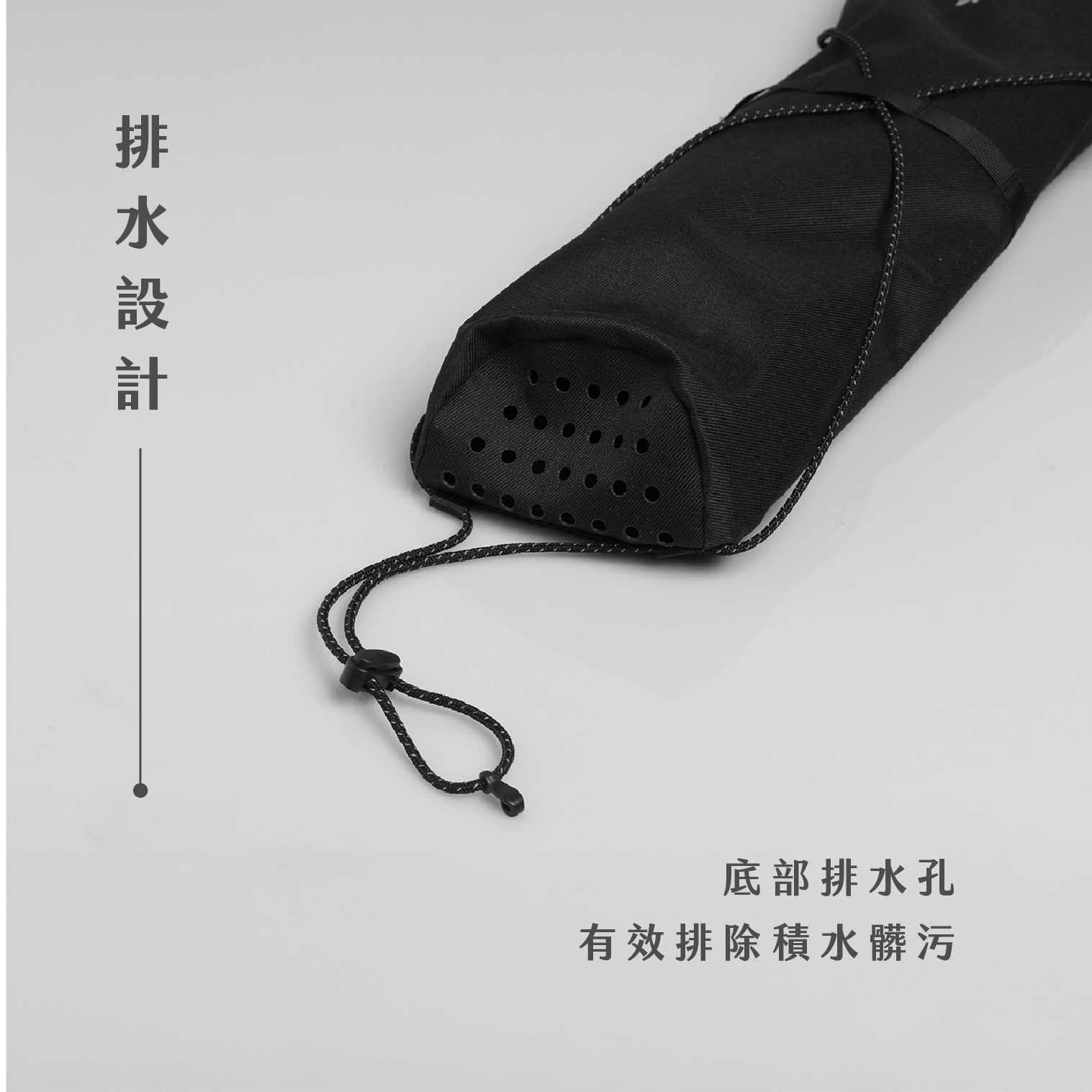 並拉緊扣具繩固定,調整杖袋鬆緊度。
