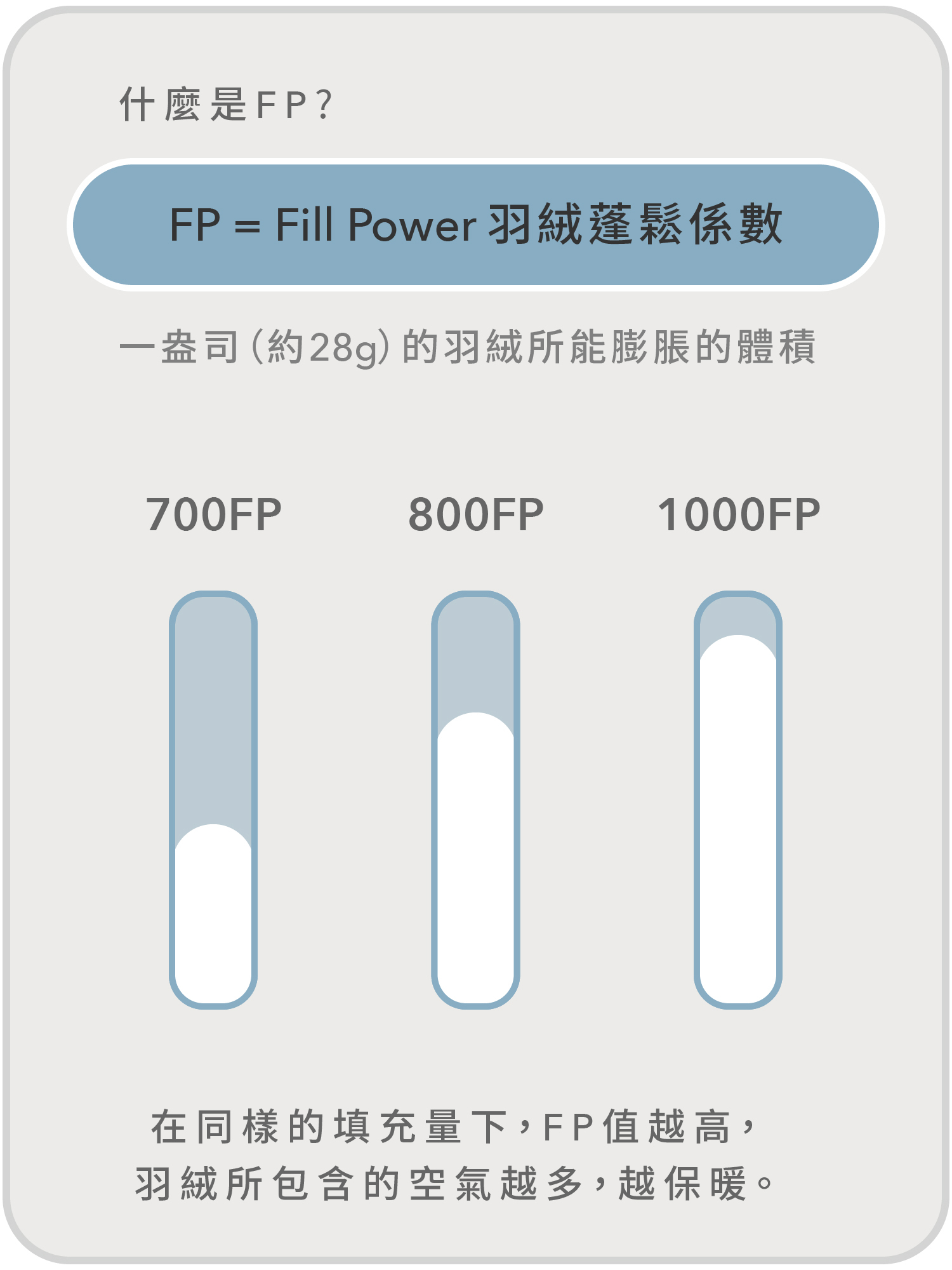 1000FP 頂級保暖 > 900FP 高規保暖 > 750FP 保暖