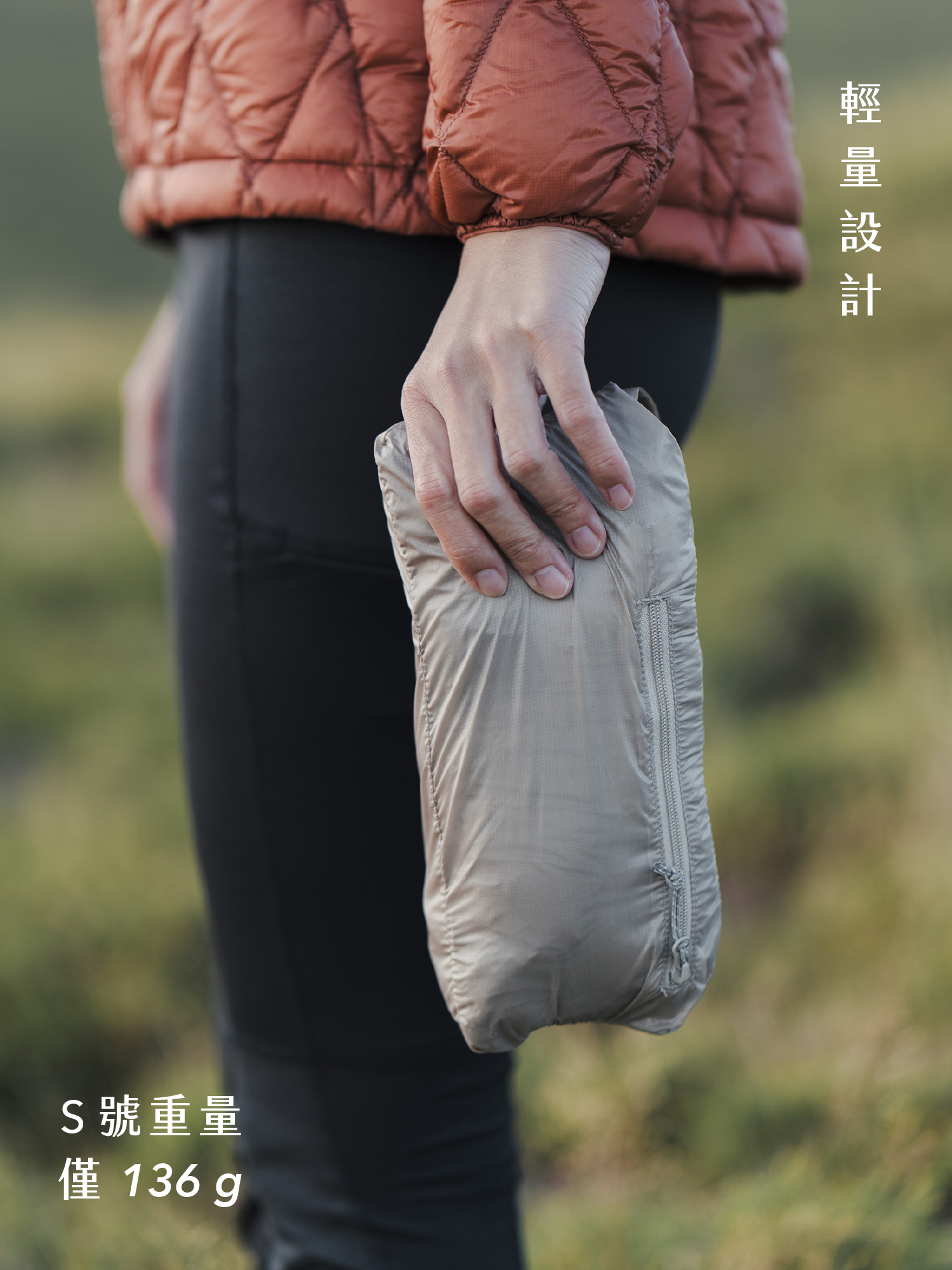 雖然表布有防潑水,但羽絨遇到雨水,會失去抓空氣的能力,無法維持暖度,下雨時記得加件防水外套在外面才可維持羽絨的保暖度。