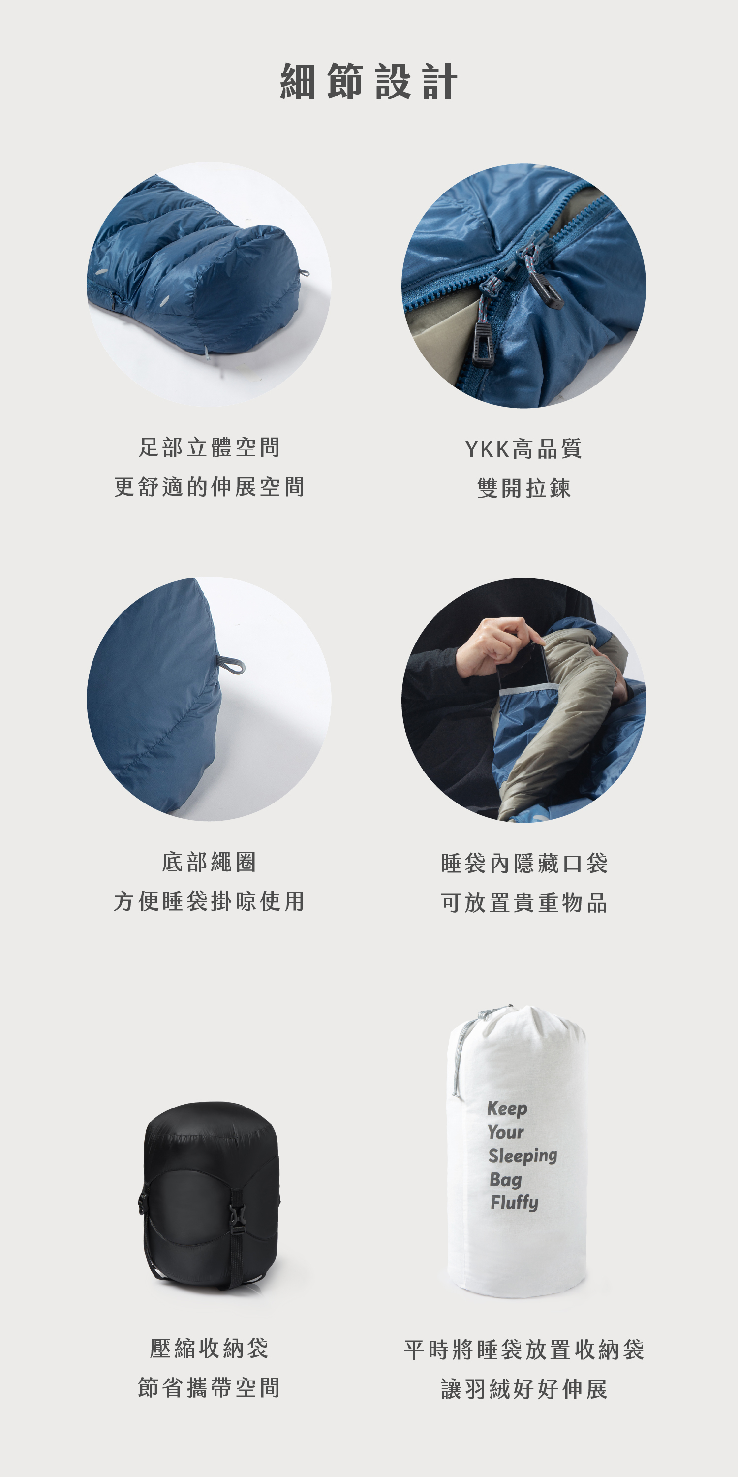 另一個很棒的部分是睡袋內部空間相當寬裕,我167/55睡S號剛剛好,睡眠過程中可以輕鬆調整睡姿,非常適合習慣側睡的人,蜷縮身體或平躺時屈膝都不會卡腳。