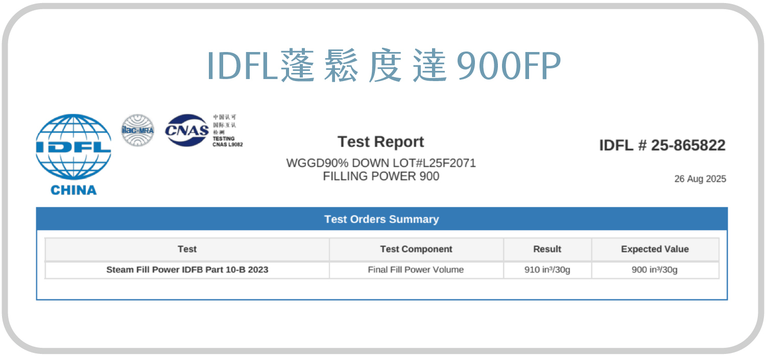 · 900FP蓬鬆度,90/10的鵝絨梗比。