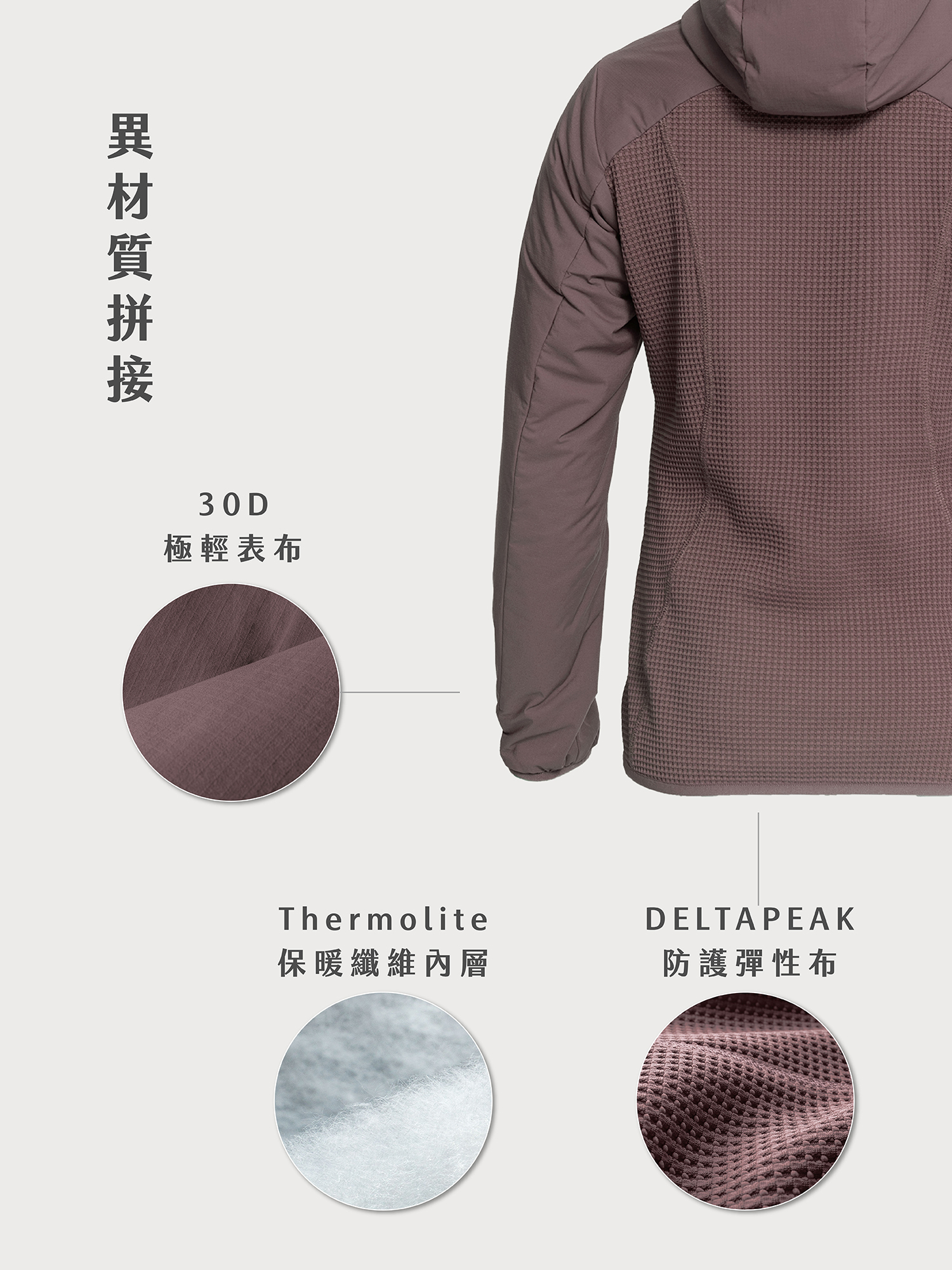 · 使用Thermolite -eco 回收化纖棉,抵抗濕氣的保暖外套