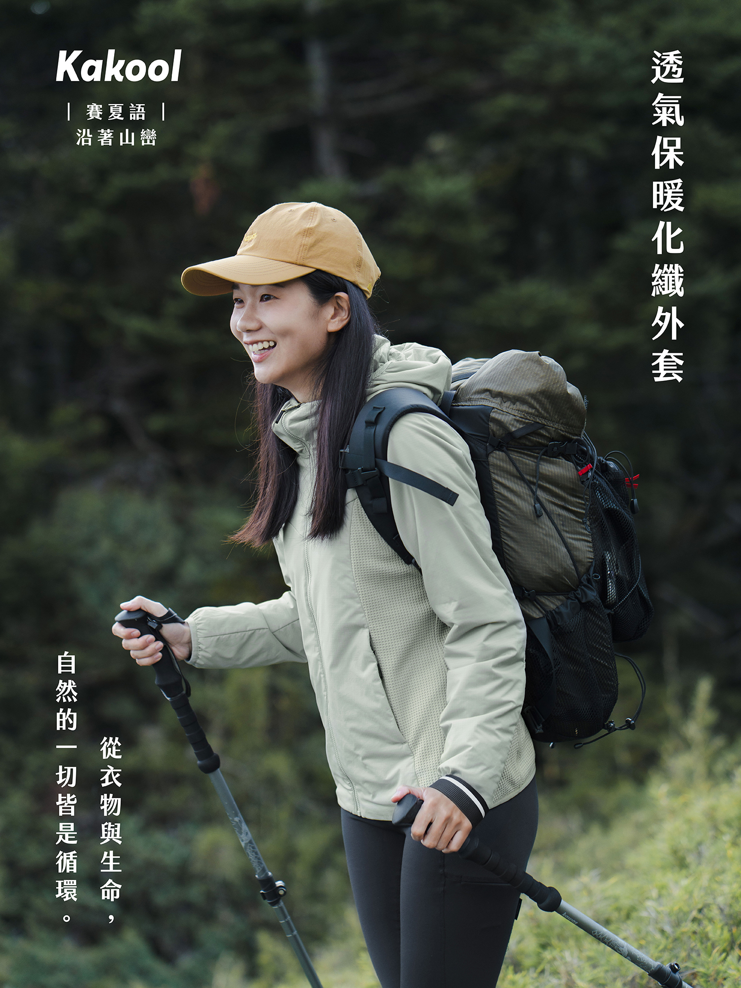 【Kakool 透氣保暖化纖外套】表布較自然棉感,耐磨加強30D,含35%以上的再生填充物,保暖度實測CLO1.57。因拼接彈性布料,背後有透氣孔,更合適活動度高的行程。