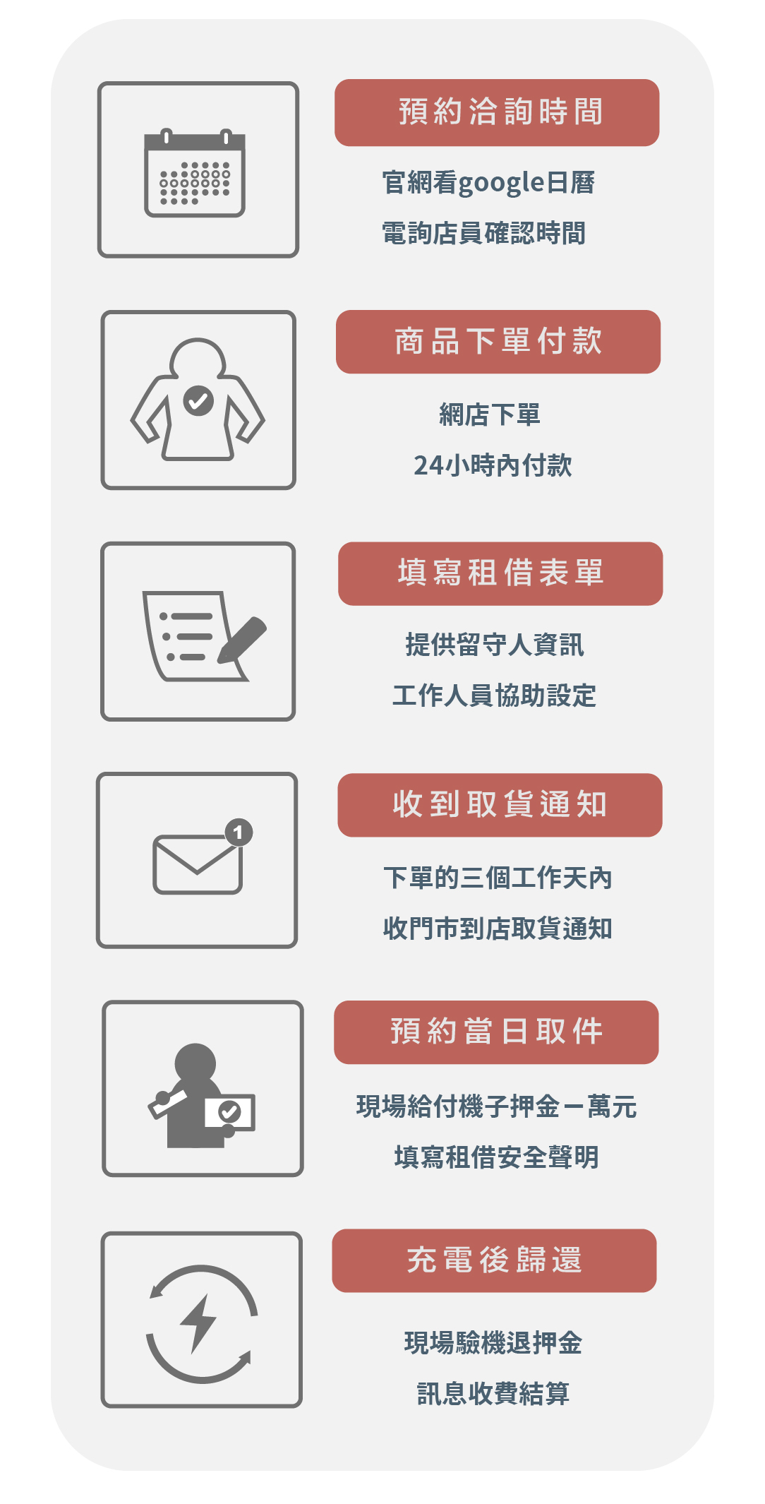 1.於電話口頭預約後的24小時內,與此頁面進行付款2.確認預約成功後,店員會登記日期於行事曆上。並再請填寫租借資訊表單,我們會協助做基本設定。3.完成以上步驟,將於三日內收到『商品已抵達』的取貨通知,才算預約成功。並請於預約日當天,到店取貨,需同時支付押金10000元 (現金)與簽署租賃合約。
